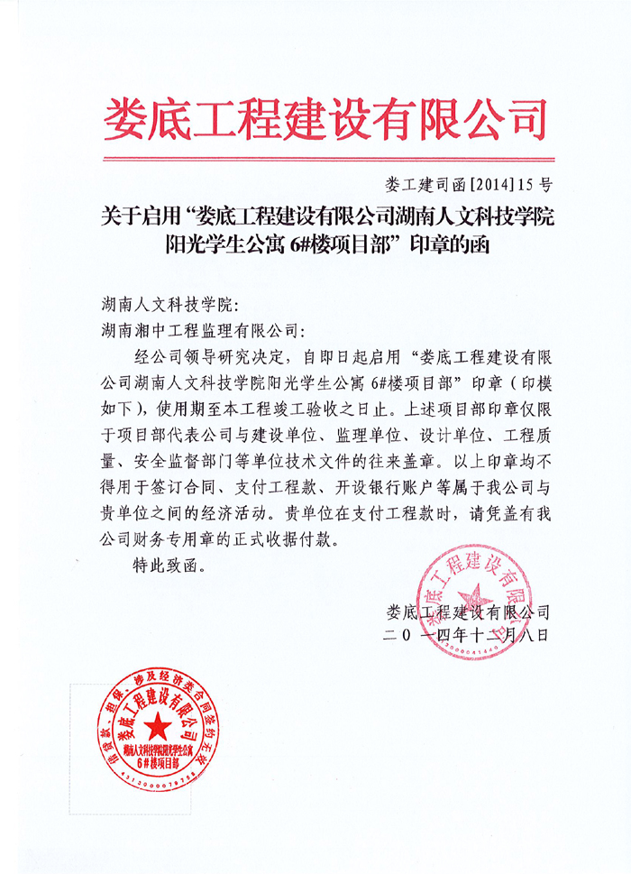 關于啟用人文科技學院陽光學生公寓6#樓項目部印章的通告