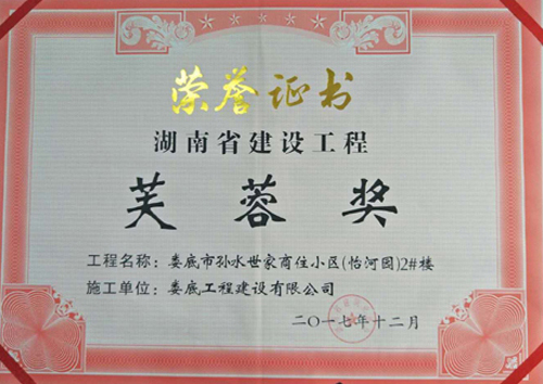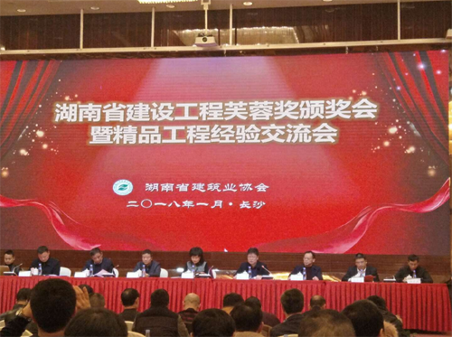 2018年1月19日,由湖南省建筑業(yè)協(xié)會舉辦的湖南省建設(shè)工程芙蓉獎頒獎會暨精品工程經(jīng)驗交流會在長沙舉行。我司承建的婁底市孫水世家商住小區(qū)(怡河園)2#樓獲得湖南省建設(shè)工程質(zhì)量最高獎—“芙蓉獎”殊榮。這是我司自市農(nóng)業(yè)銀行綜合樓、市委市人民政府辦公樓1#、6#、7#、雙峰縣體育中心體育館喜獲“芙蓉獎”后,第四次獲得“芙蓉獎”殊榮。