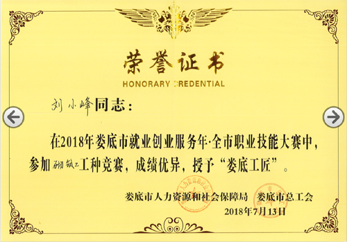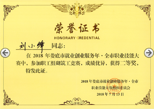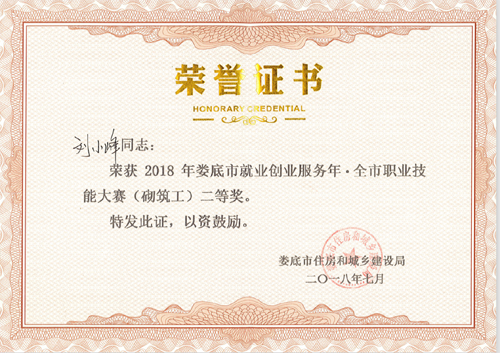 2018713日,由婁底市人力資源和社會保障局、婁底市總工會、婁底市住房和城鄉建設局主辦的“2018年婁底市就業創業服務年.全市職業技能大賽”圓滿落幕。我公司選送的參賽選手劉小峰獲職工組砌筑工競賽二等獎,并被授予“婁底工匠”。