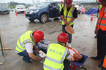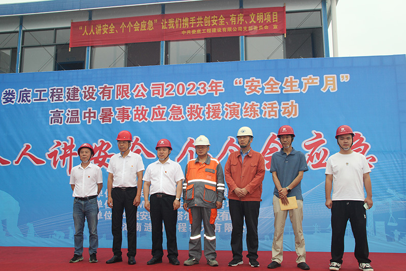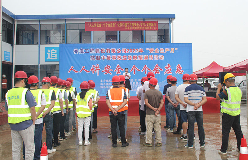 為響應省、市2023年“安全生產月”活動有關文件要求,圍繞“人人講安全  個個會應急”的主題進一步提高公司安全管理水平,規范公司安全生產過程的管理工作,本著"安全第一、預防為主、綜合治理"的安全管理方針,在發生高溫中暑事故時,能夠迅速有效進行搶救,通過高效率的組織體系應對突發事件,以最短時間、 最有效的方法控制和減少人員財產損失,減少人身傷害事故。公司于2023年6月13日上午10時在VAMA保障性租賃住房項目部開展高溫中暑事故應急救援演練活動。婁底市經開區住房和城鄉建設局領導李愛民先生、康城先生,建設單位代表藍斌先先,監理單位代表劉少勇先生,公司總經理胡勁、黨支部書記何林、副總經理彭洪偉出席了次此活動,公司各部室及婁底城區中心項目部近40余人參加了此次活動。